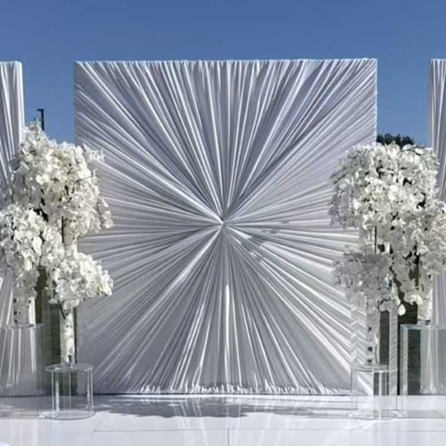 Rideau blanc croisé au centre, idéal pour réaliser un joli décor sur votre événement.