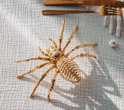 Pour compléter votre décoration de table nous vous conseillons également nos scorpions dorés et nos têtes de mort doré et nos araignées en velours noir disponibles également en location .